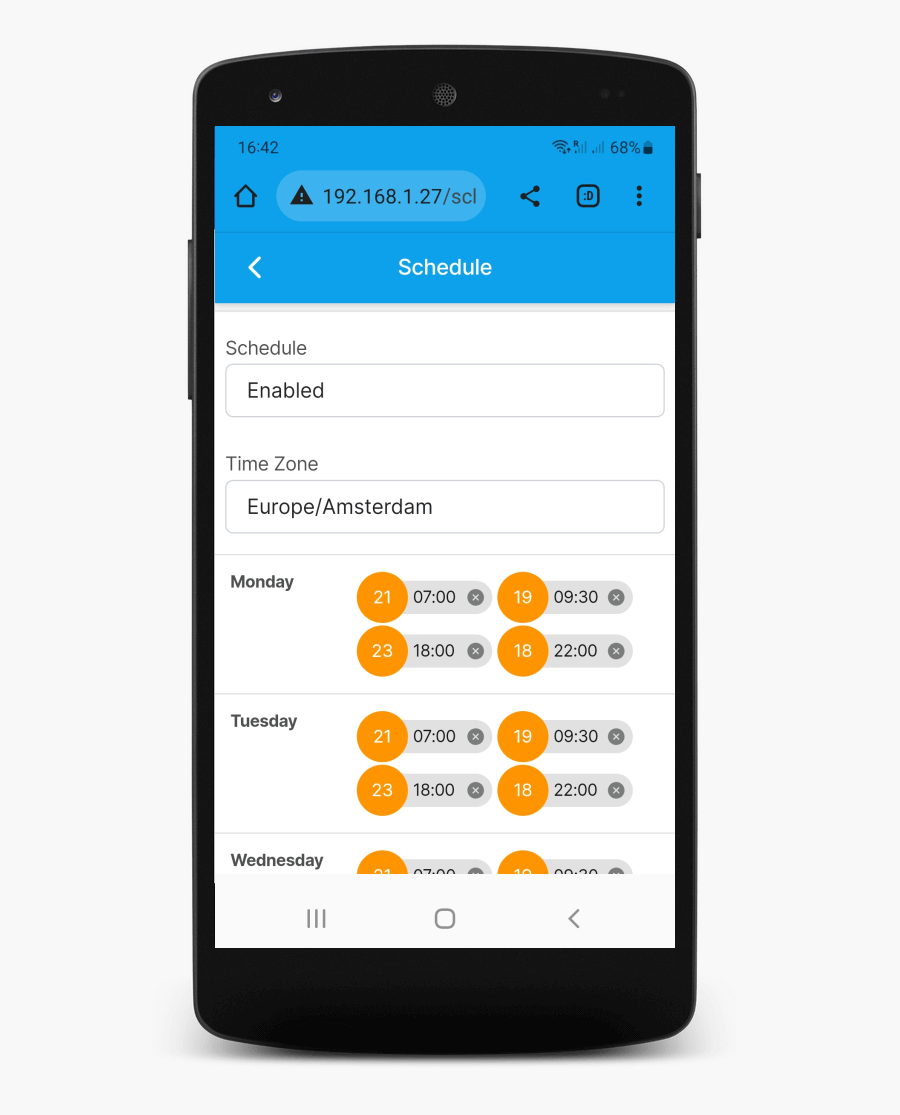 - Schedule page. Enable/disable shedule, select time zone, add weekly setpoints for each day
